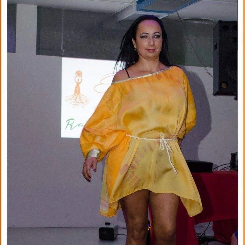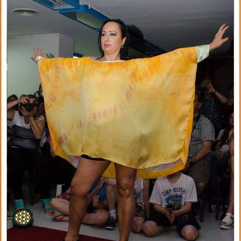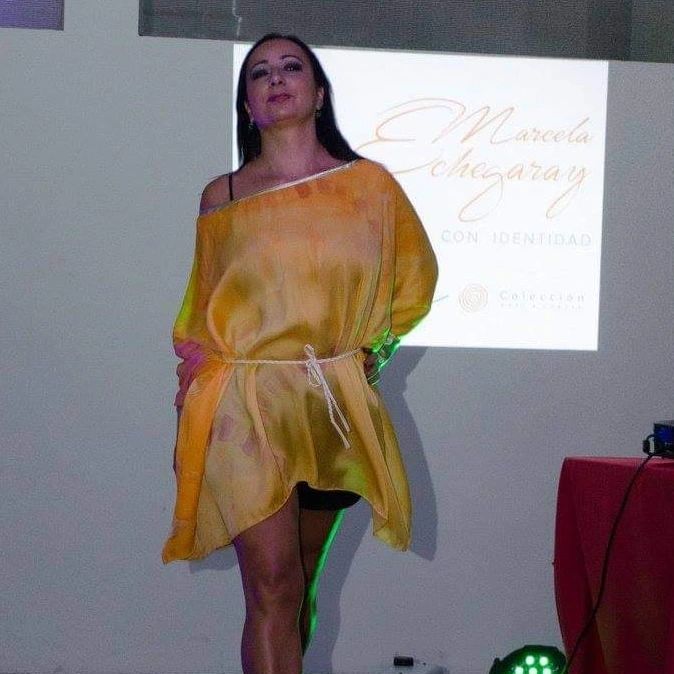 Túnica suelta, ancha y amplia, con puño realizada en satén, con tela previamente pintada en forma artesanal.